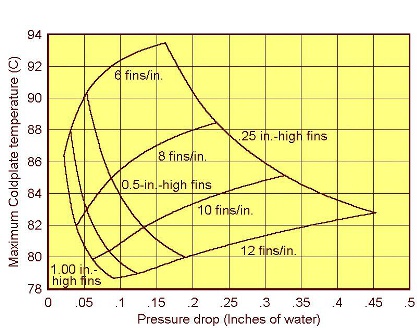 on a plot showing the resultant temperatures and pressure drops as a function of fin height and density.
